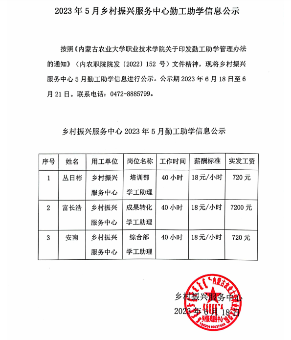 2023年5月乡村振兴服务中心勤工助学信息公示