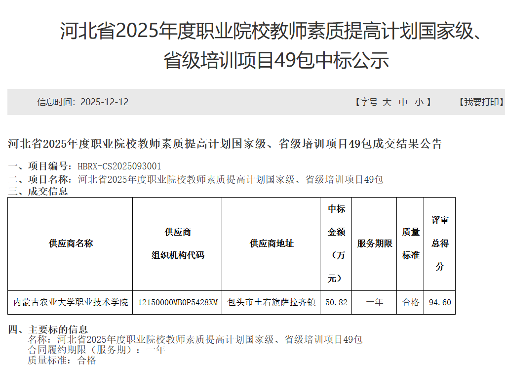 【2025·第46期】内蒙古农业大学职业技术学院中标河北省2025年度职业院校教师素质提高计划国家级、省级培训项目